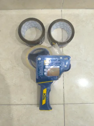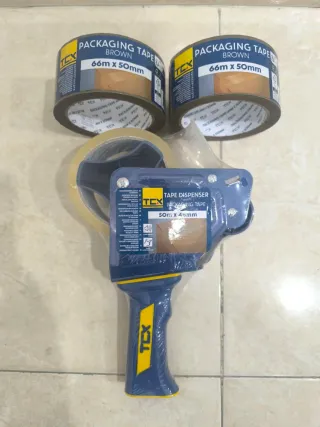 Set de pistola dispensadora de cinta de embalaje y dos rollos de cinta marrón. - Dispensador de cinta de embalaje en color azul y amarillo. - Dos rollos de cinta de embalaje de color marrón. - Medidas de los rollos: 66m x 50mm.