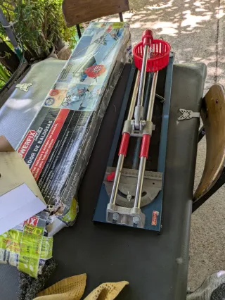 Cortadora de baldosas y azulejos Powerfix Profi. - Ideal para cortes horizontales, diagonales y agujeros. - Escuadra de precisión ajustable hasta 45°. - Base resistente con superficie de goma. - Incluye separador móvil.