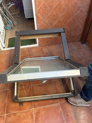 Ventana de techo abatible con marco de aluminio y cristal. - Marco de aluminio oscuro. - Cristal transparente. - Mecanismo de apertura visible.