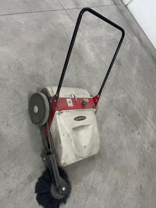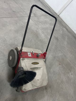 Máquina barredora de la marca Eureka. - Color principal: rojo y blanco. - Incluye cepillo frontal. - Ruedas para desplazamiento.