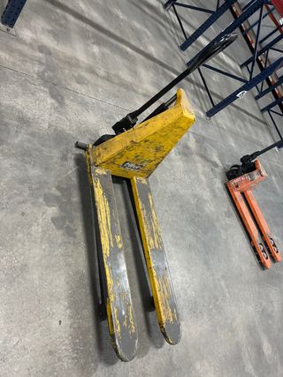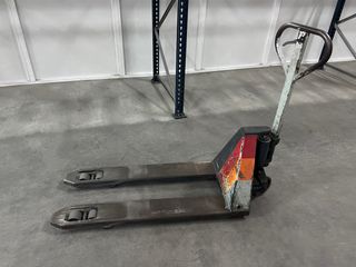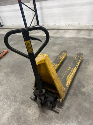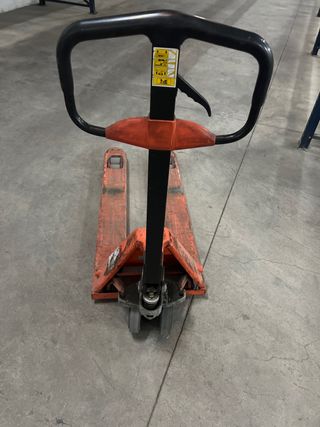 Traspaleta manual en buen estado, lista para su uso. - Estructura metálica resistente. - Ruedas dobles para facilitar el movimiento. - Asa ergonómica para un agarre cómodo.