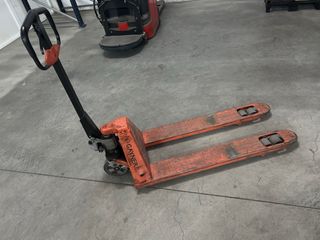 Traspaleta manual de color naranja, ideal para mover cargas pesadas en almacenes o talleres. - Estructura robusta de metal. - Ruedas para facilitar el desplazamiento. - Palanca de elevación y descenso.
