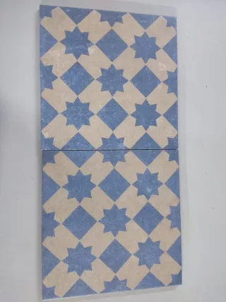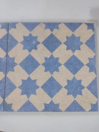 Conjunto de baldosas con un diseño geométrico de estrellas en tonos azul y beige. Miden 24'5*24'5 cm. Hay un total de 33 baldosas. - Diseño de estrella. - Colores: azul y beige. - Patrón de rombos.