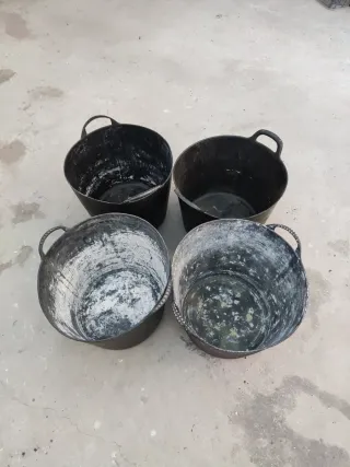 Se vende lote de cuatro capachos o cubos de plástico resistentes, ideales para múltiples usos. - Color negro. - Con asas para facilitar el transporte. - Diseño robusto.