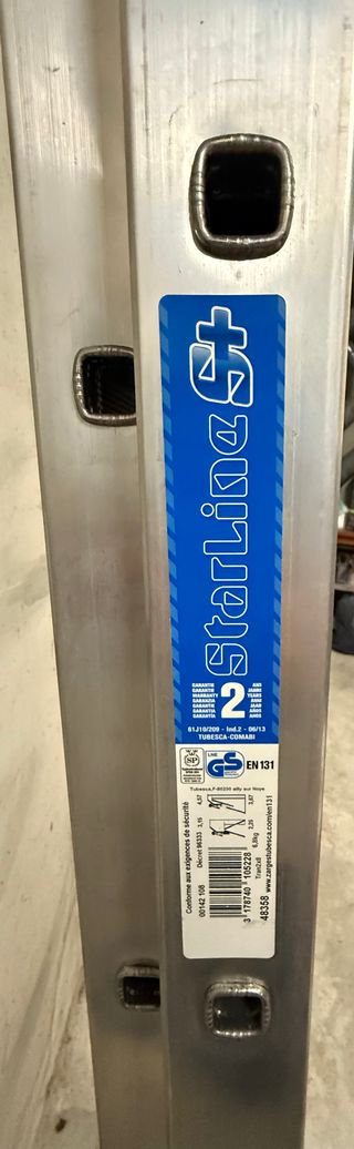 Escalera de aluminio de alta resistencia, ideal para trabajos en altura. Escalera ALUMINIO STARLINE Ideal para el mantenimiento de la casa y el entorno * Trabajo sobre suelo plano o en plano inclinado. * Producto fabricado en Francia. Se suministra con correas antiseparación. - Fabricada en aluminio ligero y duradero. - Diseño plegable para un fácil almacenamiento y transporte. - Peldaños antideslizantes para mayor seguridad. - Incluye cintas de sujeción azules. La escalera de aluminio combinada Tubesca Starline es un producto versátil que se puede utilizar tanto en posición de tijera como en forma de escalera extensible manual.