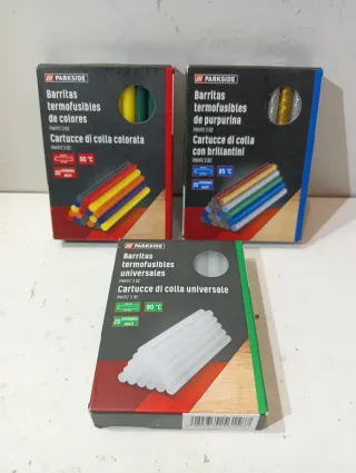 Producto Totalmente Nuevo en su Caja 📦 Lote de 60 barras de pegamento termofusible de la marca PARKSIDE. - 20 barras de colores. - 20 barras con purpurina. - 20 barras universales. Lidl , Bosch, Maquita, Dewalt, Stayer , Inverter , Worx , Metabo , Einhell , carpintero, carpintería, batería, pintór , pintura , reforma, obra , metal , percusión, batería radial, amoladora, sierra caladora circular láser , compresor, llave , atornillador, atornilladora, soldar , soldadura, aparato, pistola, grapadora, lijadora herramienta compresor, ingletadora, impacto, fresadora, broca , aspiradora, taladro martillo