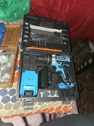 Taladro percutor 21 v batería con su maletín de transporte y accesorios. - Incluye taladro, batería y cargador. - Maletín negro con compartimentos para accesorios. - usado muy poco .taladro de 21 v. - oferta!!
