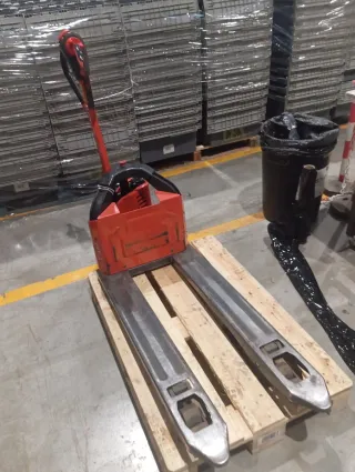 Transpaleta manual en buen estado, lista para su uso. - Estructura robusta de metal. - Ruedas resistentes para facilitar el movimiento. - Palanca de elevación y descenso.