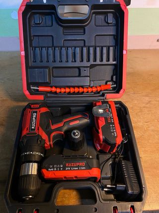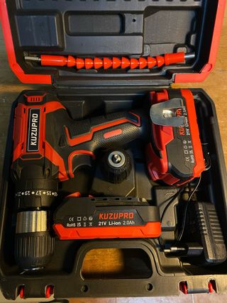 Taladro percutor atornillador de la marca KUZUPRO. - Incluye dos baterías de 21V Li-ion 2.0Ah. - Viene con cargador. - Incluye accesorio flexible para puntas. - con dos portabrocas el de origen y otro de 13mm - las fotos forman parte de la descripción
