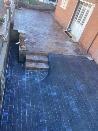 Suelo de hormigón impreso con acabado de alta calidad. - Diseño imitando piedra. - Color gris oscuro con detalles en azul.