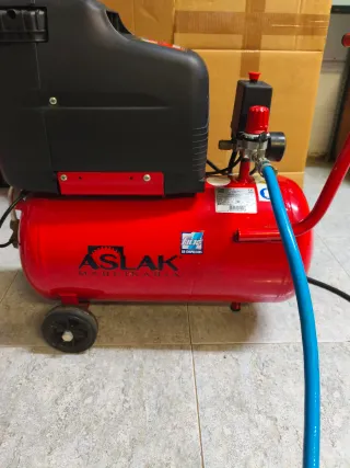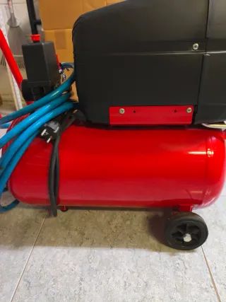 Compresor de aire Fiac con depósito. - Compresor nuevo usado dos veces para hinchar las ruedas del coche. - Manguera de 5 metros con pistola. - Ruedas para fácil transporte.