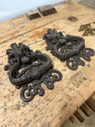 Medidas 19x13x3,5 Precio por las dos unidades. Aldaba de hierro forjado con un diseño ornamental. También llamado picapiertas o llamador. En perfectas condiciones - Material: Hierro forjado. - Estilo: Clásico y decorativo. - Acabado: Oscuro, con textura. Aldaba antigüedades llamador picaporte puerta hierro forjado decoración