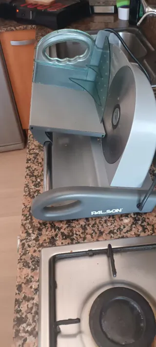 Cortadora de carne plateada, ideal para el hogar o pequeños negocios. Su diseño robusto y acabado metálico le dan un aspecto profesional. - Cuchilla circular de acero inoxidable. - Bandeja de corte ajustable. - Base antideslizante para mayor seguridad.