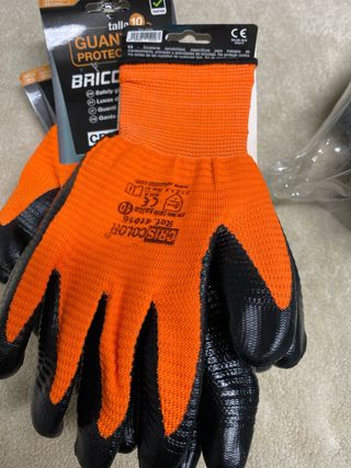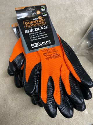 Guantes de protección Criscolor, talla 10. - Color naranja y negro. - Material: 45% Poliéster, 55% Poliuretano. - Certificación EN388:2016+A1:2018. - 5 pares....1,5 cada par