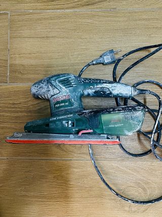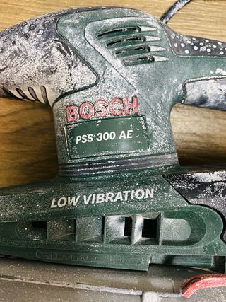 Lijadora orbital de la marca Bosch, modelo PSS 300 AE. Diseñada para un lijado eficiente. - Sistema de microfiltro integrado. - Bajo nivel de vibración. - Funciona perfectamente