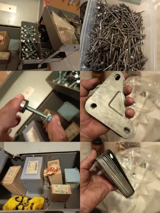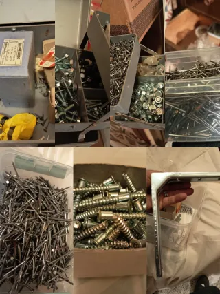 Gran lote de material de ferretería variado, con un peso aproximado de 20 kg. - Tornillos de diferentes tamaños. - Clavos. - Soportes metálicos. - Otros accesorios de ferretería.