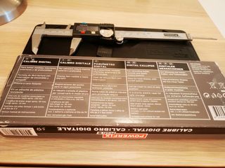 Calibre digital de la marca POWERFIX. - Pantalla LCD. - Botones ON/OFF y ZERO. - Escala en mm y pulgadas. Tiene el vidrio agrietado