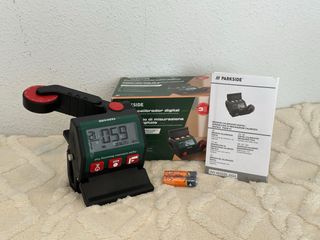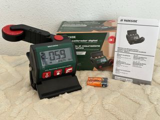 Medidor-calibrador digital de la marca Parkside. Permite calibrar el grosor de la hoja de sierra e insertar la pieza de trabajo bajo la rueda de medición. En su caja sin abrir - Precisión de medición: ± 0,5 mm. - Altura máxima del tope: 95 mm. - Anchura máxima de corte: 90 mm. - Unidades de medida: mm / in, ángulo.