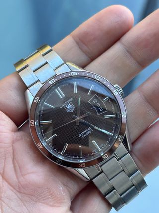 Reloj Tag Heuer Carrera Calibre 5 con movimiento automático. Un clásico de la relojería suiza. Full set del 2012 39mm - Esfera marrón con patrón cuadriculado. - Indicador de fecha. - Bisel con escala. - Brazalete de acero inoxidable. Cualquier duda estare encantado en resolverla!