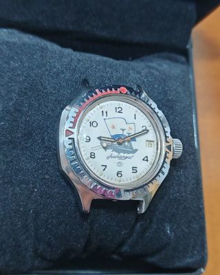 Preciosa pieza de relojería. Un reloj de pulsera vintage Vostok de fabricación rusa, con correa de cuero negra. - Diseño vintage con la bandera de Rusia y el escudo de armas. - Caja de acero inoxidable 37 mm y 11mm de altura. - Mecanismo manual con calibre 2209. - En muy buen estado estético.