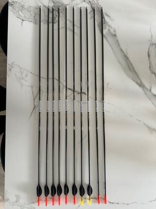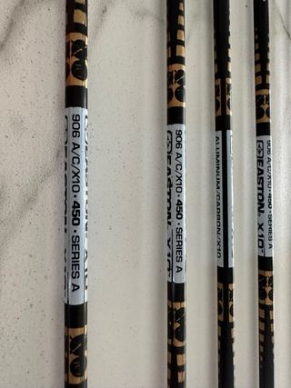10 tubos Easton X10 calibre 450. Longitud de los tubos solos 733mm. Se entregan con pines y las plumas que se ven en las fotos (usadas). Sin culatines ni puntas.