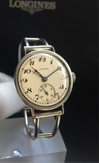 Reloj Longines original de pulsera, fabricado aproximadamente entre 1933 y 1939. Movimiento: Mecánico de cuerda manual, calibre Longines original. Funciona perfectamente. Caja de Plata maciza 0.925, con sellos suizos visibles, diámetro 31 mm. Esfera original, con numerales árabes estilo Breguet, agujas azuladas. Longitud de la correa 160-180 mm. Segundero pequeño a las 6, asas fijas tipo alambre, muy características de la época, años 30 (pre Segunda Guerra Mundial)