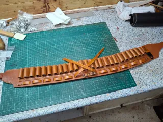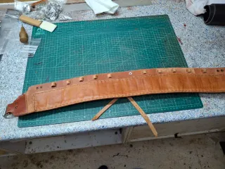 Preciosa canana para cartuchos de escopeta, calibre 12, hecha de cuero marrón. Es una pieza artesanal, robusta y con un diseño clásico. - Fabricada en cuero de primera calidad. - Capacidad para varios cartuchos. - Diseño clásico y funcional. - Ideal para caza o coleccionistas.
