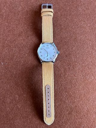 Reloj Citizen modelo BE9070 con movimiento de calibre 1045. Un accesorio elegante y funcional. - Esfera clara con números arábigos. - Correa de tela color mostaza. - Cierre de hebilla metálica.
