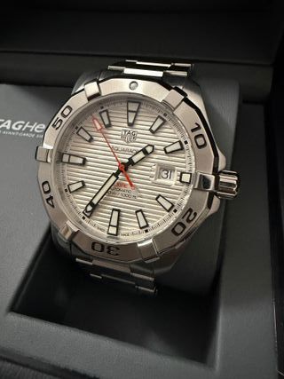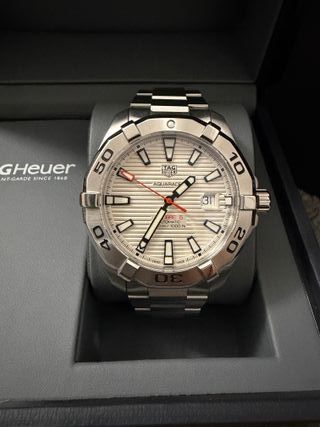 Marca: TAG HEUER Modelo: Aquaracer 300MT 43 mm esfera blanca, reloj automático Calibre 5 Número de referencia: WAY2013 – WAY2013.BA0927 Año de producción: 2023 Caja / Tamaño: Acero inoxidable / 43 mm (sin corona) Grosor de la caja: 12,5 mm (incluido el cristal de zafiro) Fondo de caja: Acero inoxidable con tapa trasera atornillada resistente al agua