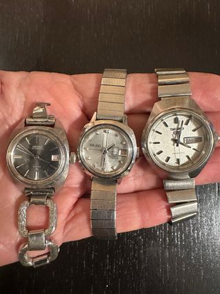 Lote de tres relojes Seiko señora automáticos. Un Seiko Lady Matic con referencia de caja y modelo 2517-0211 mecánico automático de 21 jewels años 60 70 la corona va un poco dura Un reloj Seiko automático de movimiento 2517B indica un calibre de 21 joyas mecanico automatico años 60 70 la corona va un poco dura Un Seiko 5 vintage conocido por su fiabilidad y durabilidad. equipado con el movimiento automático calibre 2908 años 70. Funcionan al darle movimiento pero necesitan puesta a punto. Estado ver fotografías. Envío por Correos