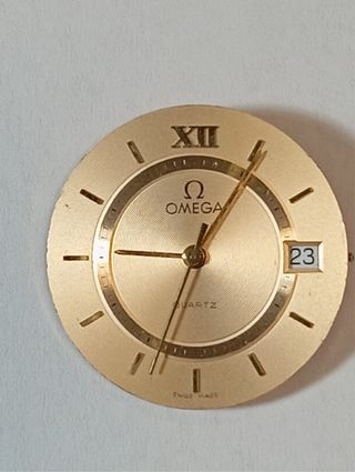 Pieza de maquinaria para reloj de la marca Omega. Diseño clásico y elegante. Calibre 1430 - Esfera dorada con números romanos. Mide 2,7 cm - Indicador de fecha. - Movimiento de cuarzo. Precio no negociable