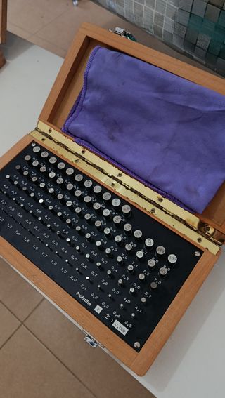 Set de calibres de pasador de precisión en caja de madera. - Incluye una variedad de medidas para calibración. - Caja de madera con interior forrado en tela morada. - Medidas grabadas en cada pasador.