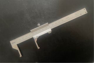 Calibre de precisión de la marca Mitutoyo, fabricado en Japón. Incluye su funda protectora. - Material: Acero inoxidable. - Escala en milímetros y pulgadas. - Funda de cuero sintético marrón.