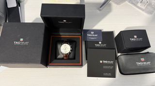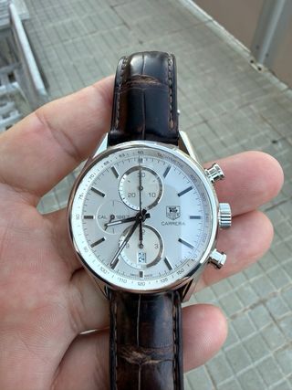 Reloj cronógrafo Tag Heuer Carrera con calibre 1887. Incluye su caja original y documentación. - Caja de reloj Tag Heuer. - Caja de presentación. - Estuche de viaje. - Manual de instrucciones y tarjetas de garantía. Entrega en mano en Zaragoza. Adquirido en 2012 se le cambio la maquinaria completa en garantía en 2014. Poco usado (fue el regalo de jubilación de mi padre), casi siempre en estuche. En 2020 se le hizo servicio y desde entonces no se ha usado el reloj. Se adjuntan hojas de servicio. Con luz exterior el reloj tiene una tonalidad mas blanca.