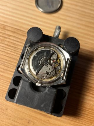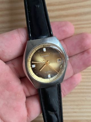 Se pone a la venta este precioso reloj Citizen automático de época, un auténtico clásico con un marcado estilo retro. Destaca especialmente por su espectacular esfera en tonos marrones con efecto degradado (fumé) y rayos de sol, enmarcada por un elegante anillo interior estriado en tono dorado. Monta una robusta caja de acero inoxidable tipo cojín (cushion case), muy característica de la relojería de los años 70. A nivel mecánico, late en su interior el legendario y fiable calibre 8210A de Citizen. Como se puede apreciar en las fotografías del mecanismo, el movimiento se encuentra muy limpio y cuidado, solo algo de desgaste por años