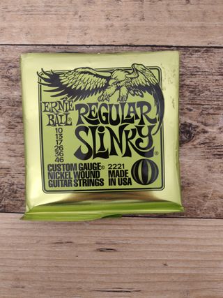 Cuerdas para guitarra eléctrica de la marca Ernie Ball, específicamente el modelo Regular Slinky. Esta incompleta, estan solo los calibres que aparecen en la foto: .013, .026, .036 y .046.