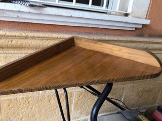 Leja de esquina de madera con bordes en las partes que van en la pared para fijar con tornillos. Está barnizada en color almendra. Los lados miden 43,5 × 60 de frontal y 34 de fondo desde el centro