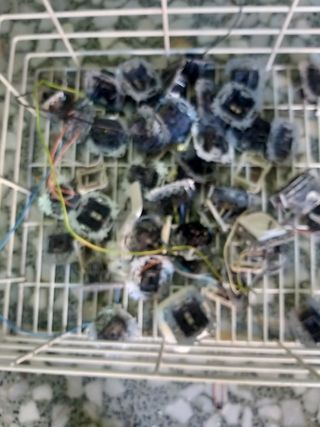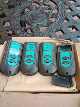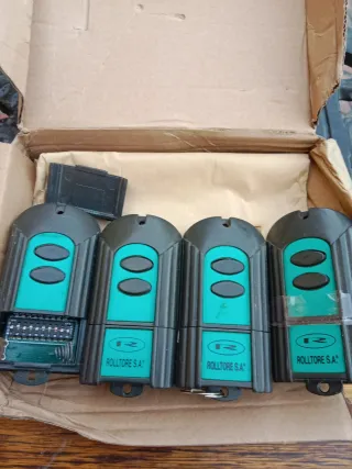 Lote de cuatro mandos para puerta automática de la marca Rollstore S.A. - Diseño en color verde y negro. - Cada mando tiene dos botones. - Uno de los mandos muestra su circuito interno.modelo R42/290 y la frecuencia 29.990 se vende por haber cambiado el sistema de la puerta