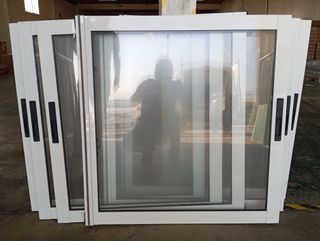 Ventana corredera de aluminio en color blanco, de dos hojas y cristal. Medidas: 87 x 156 Cada unidad vale 80 €