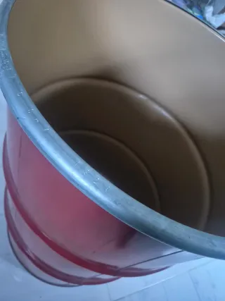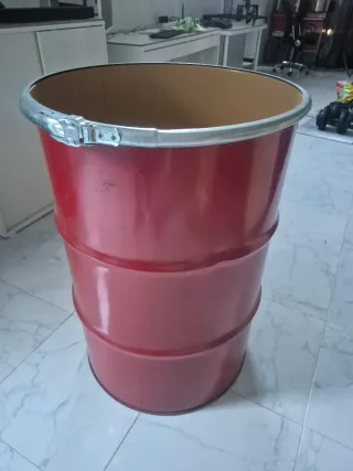 Vendo bidón tengo 8 metálico de acero en color rojo vibrante. No tiene tapa, lo que lo hace perfecto para proyectos de decoración. Usos sugeridos: Ponle un tablero redondo de madera o cristal encima y tendrás una mesa alta tipo bar espectacular. También sirve como expositor en tiendas o como un paragüero de gran capacidad para locales. Estado: Estructura sólida, con el borde superior reforzado (incluye el aro metálico decorativo que se ve en la foto). Estilo: Industrial, vintage, garaje.