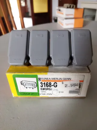 Lote de 4 clavijas eléctricas Eunea Merlin Gerin modelo 3168-G. - Color gris. - Tipo: Clavija 2P+1. - Intensidad: 10/16A. - Tensión: 250V. - Modelo: Europoli.