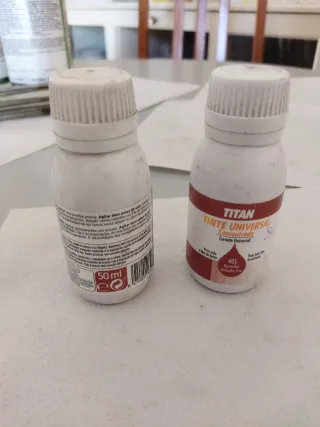 Lote de dos tintes universales de la marca Titan en color bermellón. 2 unidades - Tinte concentrado. - Color: 405 Bermellón. - Para todo tipo de pinturas.
