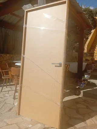 Puertas con acabado de roble. - Diseño moderno con veta horizontal. - Incluye manilla plateada. Son 4 puertas a 100€ 3 abren hacia la derecha y 1 hacia la izquierda. Medidas de 3 puertas 2,02m allto y 0,86m ancho Medidas de 1 puerta 2,02m alto y 0,76 ancho