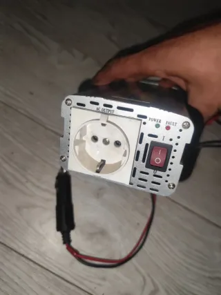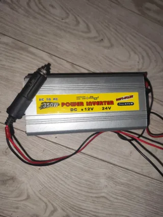 Inversor de corriente DC a AC con una potencia de 350W y un pico de 875W. Ideal para convertir la corriente continua de tu vehículo en corriente alterna. - Conexión a toma de mechero de coche. - Indicador de entrada DC 12V. - Indicador de salida AC 24V. - Diseño compacto y robusto.