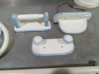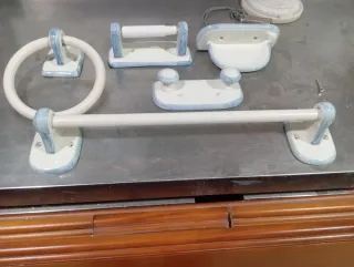 Conjunto de accesorios de baño de cerámica con detalles en azul. - Toallero de aro - Portarrollos - Jabonera - Toallero barra - Colgador doble Lo que se ve en la foto