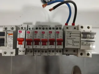 Conjunto de interruptores diferenciales y protectores de tensión. - 6 interruptores LS BKP C25, C20, C16, C20, C16, C20. - 1 protector de tensión YJOG-40. - 1 interruptor Simon C40.