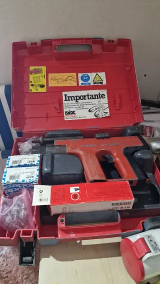 Pistola de clavos Hilti DX 450 en su maletín. - Incluye maletín rojo. - Incluye caja de clavos. - Incluye manual de instrucciones. De regalo unas cuantas cajas llenas de clavos Hay que recogerlo en umbrete