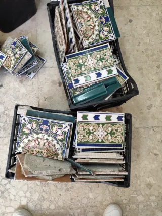 Conjunto de 146 azulejos antiguos con motivos decorativos. - Cada azulejo presenta un diseño único. - Motivos variados que incluyen escenas costumbristas y figuras. - Borde decorativo azul en la mayoría de las piezas. - Ideal para coleccionistas o proyectos de restauración. - A 1 euro la pieza