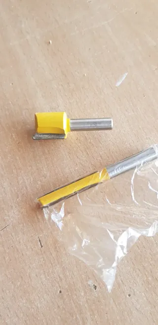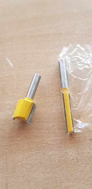 Set de fresas para router de madera, ideales para trabajos de carpintería. - Color amarillo y plateado. - Incluye dos fresas. Set de fresas para router de madera, ideales para trabajos de carpintería. - Color amarillo y plateado. - Incluye dos fresas. Diámetro 20 (usada) y 8 (nueva) mm Vástago de 8 mm