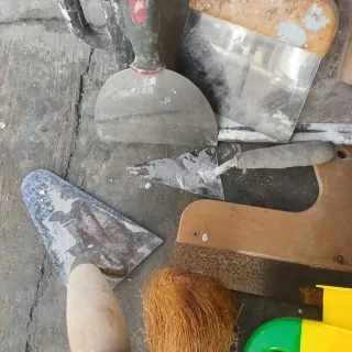 Conjunto de herramientas para trabajos de paleta y construcción. - Paletas de diferentes tamaños y formas. - Llana. - Cepillo. - Cubeta de mezcla.